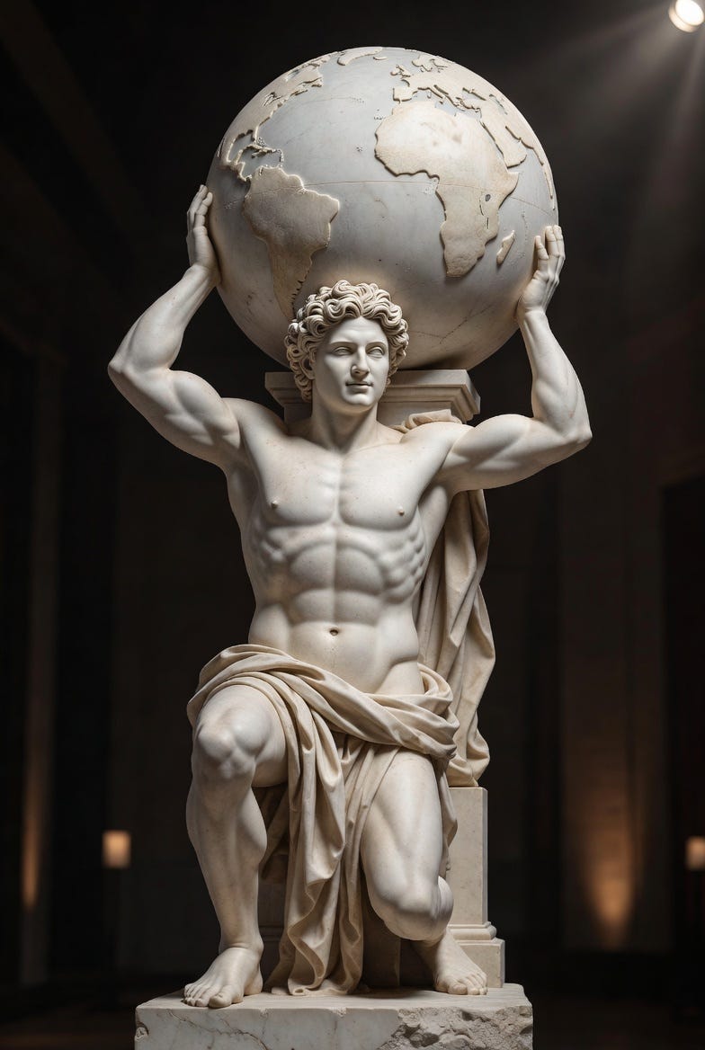 They stand in front of the pedestal on which the world is perched, and they wink at you, pretending as if they are Atlas propping it up and expecting you to play along with the charade.