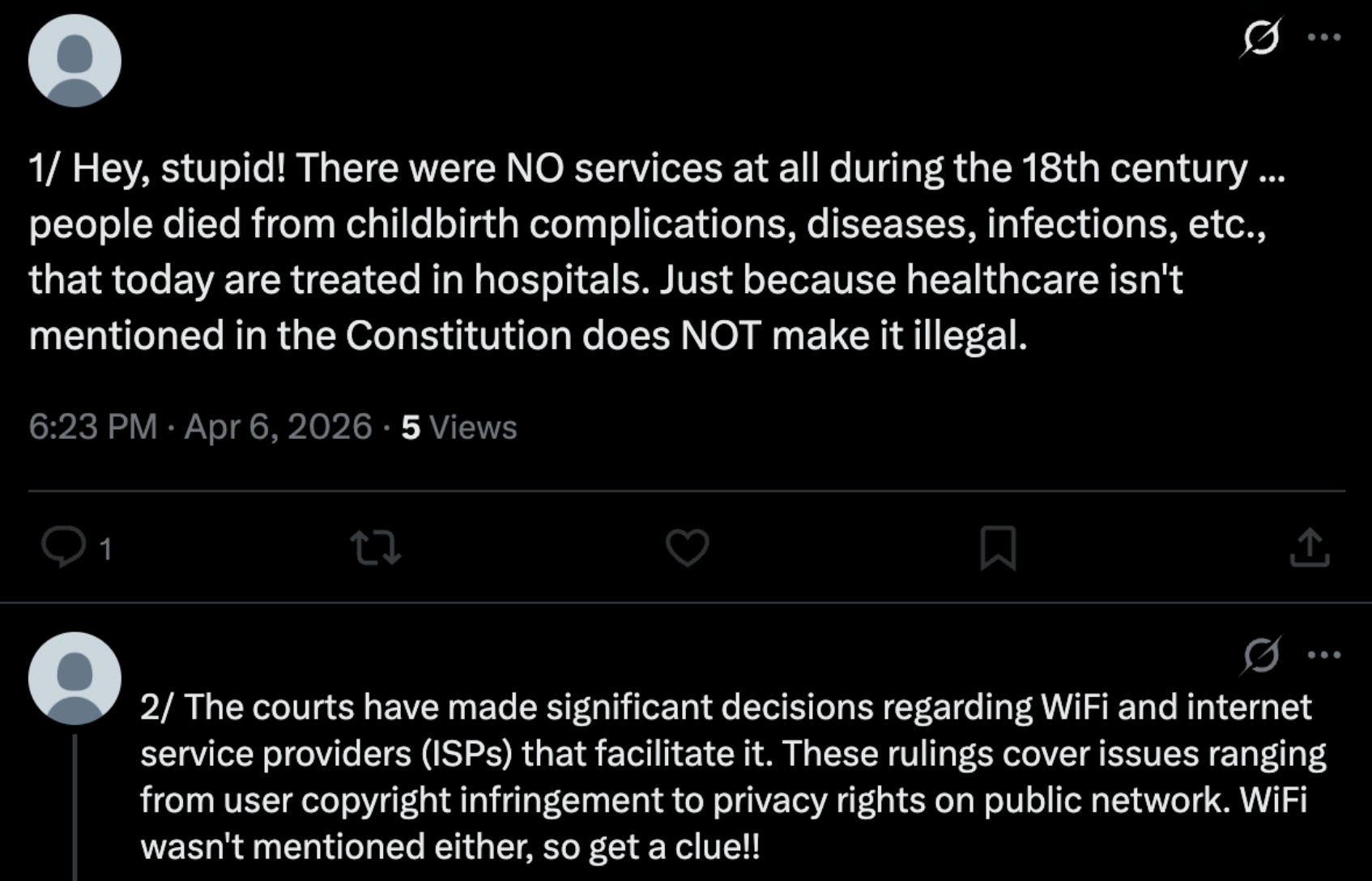 Which brings me back to my discussion on X and the arguments/statements made by the other person, who, in her lack of understanding of our founding documents and principles, was rather adamant and vitriolic in asserting not only that the government should be providing services, but that, just because the Constitution doesn’t mention something doesn’t mean the government can’t or shouldn’t do it.
